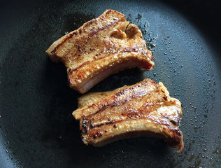 2 、热锅将腌好的猪肋排煎至金黄微焦。