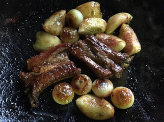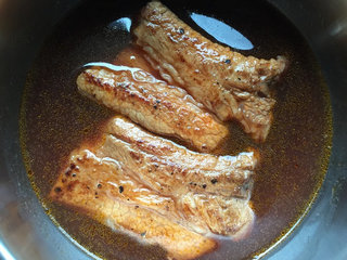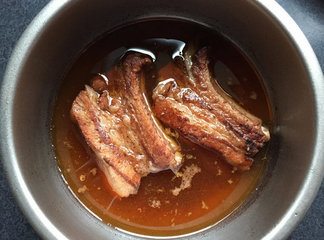 3 、将猪肋排连同波特酒,巴萨米可醋及水放小锅内,用电锅将猪肋排蒸至软嫩。