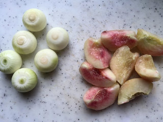 4 、珍珠洋葱剥皮去蒂头,水蜜桃去皮切块。