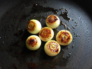 5 、另起一锅加入奶油及黄糖,融化后加入珍珠洋葱,将洋葱表面煎至金黄上色。
