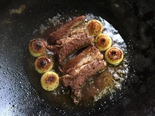 7 、将猪肋排及滤好的汤汁移到炒锅,开中火,待汤汁浓缩至1/2时加入珍珠洋葱及1小匙糖,并以适量盐及胡椒调味。