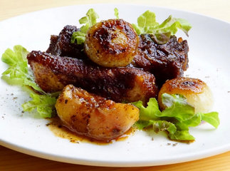 焦糖洋葱蜜桃子排,这道美食是一道充满西式风味的蜜汁猪肋排,酸酸甜甜的滋味不但好吃,而且十分的开胃,让人忍不住一口接一口,即使是在炎热的夏天里也能让人食欲大增哦!