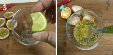 2、百香果用水果刀切开,青柠檬切成4分,取1分青柠檬切出几片薄片备用。