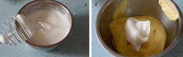 8、烤箱提前预热180度。取1/3打发好的蛋清,与蛋黄糊混合,用翻拌或者切拌的方式拌匀。