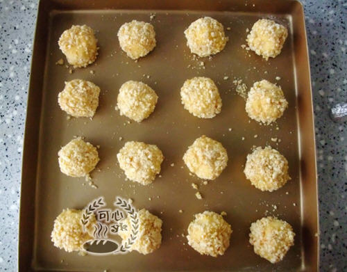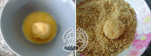 6、取一个球先沾蛋液,然后在花生碎里滚几圈,均匀裹上厚厚的花生碎。