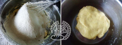 3、筛入低粉,用手直接拌匀。揉成面团,揉时不要太用力,成团即可,不要过分揉捏。送入冰箱冷藏一会儿。