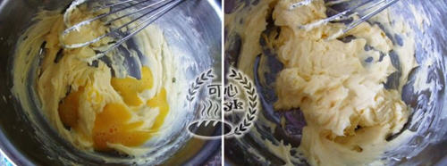 2、分三次加入打散的鸡蛋液,将蛋和黄油糖粉混合物打至体积蓬松状态(一定要充分吸收再加下一次)。