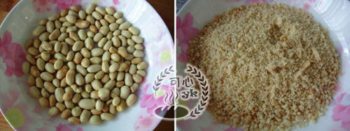 4、用微波炉将适量花生打熟后去皮,用擀面杖擀碎后备用。