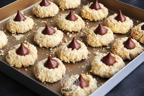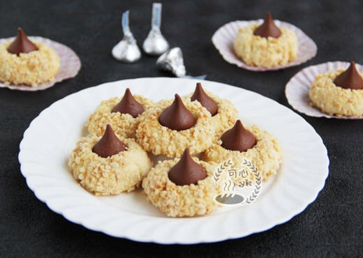 用烤箱做的kisses花生小酥饼里面是饼干,外层裹了厚厚的花生碎,上面是黑巧克力一个个的特别可爱、别致。吃起来口感特别丰富,满口留香。需要注意的是,要密封保存,否则容易变潮。