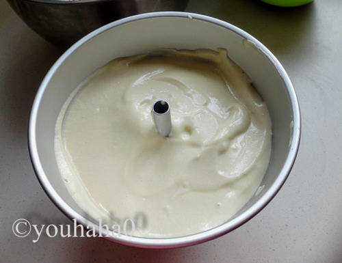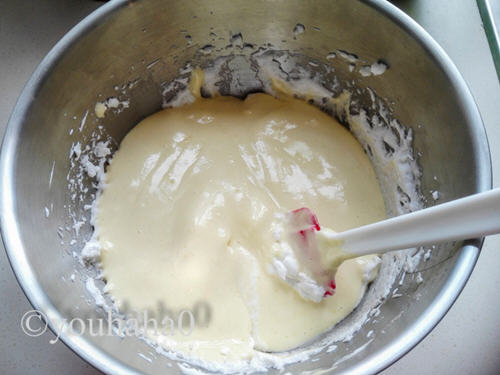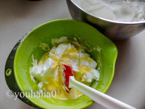 7、 拌匀的蛋黄糊倒回蛋白霜中,快速翻拌均匀。