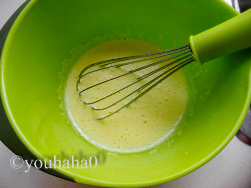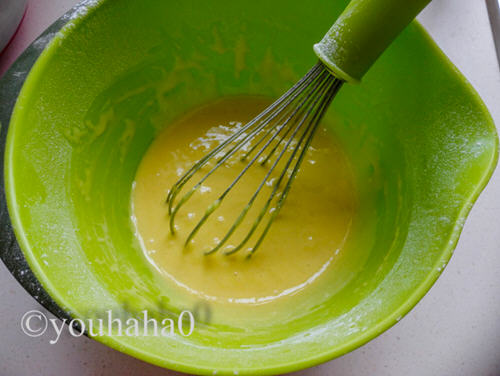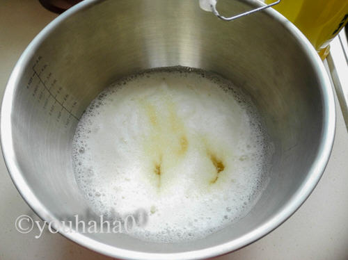 2、蛋黄液中加入植物油、清水,继续搅打均匀。