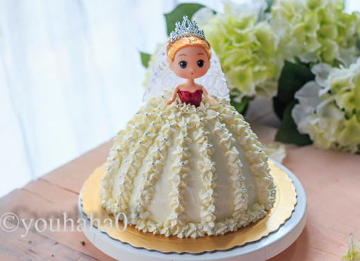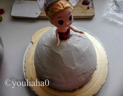 15、依次每片都涂抹淡奶油,蛋糕外部用淡奶油大致抹平,娃娃用保鲜膜包好放入放入蛋糕中间部位,蛋糕表面用花嘴挤上花纹,装饰糖珠即可;裱花手艺太烂;