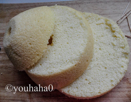 12、 脱模的蛋糕分切成厚薄大致相当的3片。