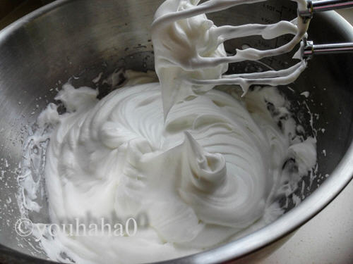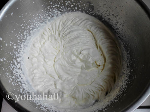 5、余下的细砂糖分2次放入,一直搅打蛋白霜至图中的样子,能拉出较直的勾即可。