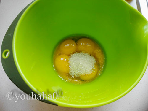 1、 分开蛋清、蛋黄至无油无水的容器中,蛋黄中加入细砂糖,搅打均匀。