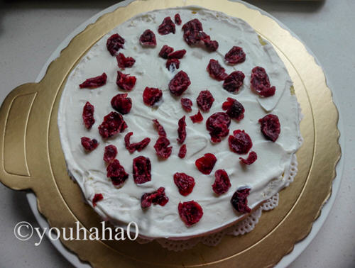 14、 取蛋糕底部摆放在托片上,抹一层淡奶油,放适量的蔓越莓干。