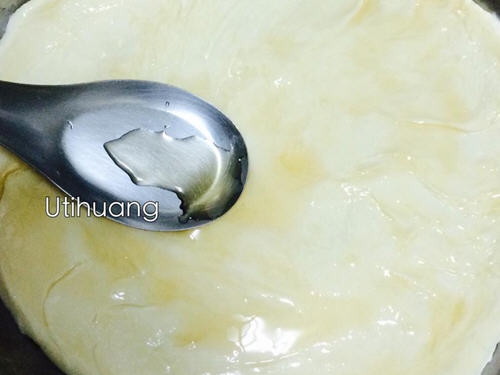 2、面团杆成薄片pizza(越薄脆越好吃)饼皮抹上一些蜂蜜。