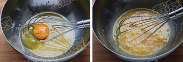 2、在融化的黄油中加入白糖和盐搅匀,打入一个鸡蛋充分搅拌至白糖融化;