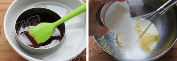4、加入混合过筛后的低筋面粉和可可粉拌匀,烤箱预热175度,