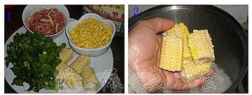 1、玉米用刀割下玉米粒,玉米杆子斩成几段;瘦肉切片或切丝后用姜丝、盐、油、生粉抓匀,腌半个小时;菜心清洗干净后切碎(菜心临放进锅前再切);