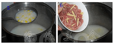 6、转大火,把腌好的瘦肉倒进粥里,用汤勺划散;