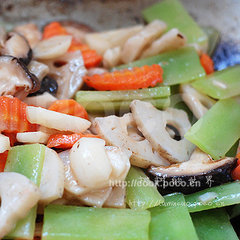 2、热锅下油,爆香姜片,倒入胡萝卜片、莲藕片略炒一两分钟后再加入马蹄、香菇和莴笋拌炒均匀,倒入酱汁翻炒至收汁即可。