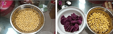 2、第二天早上泡好的黄豆和削皮切片的紫薯。