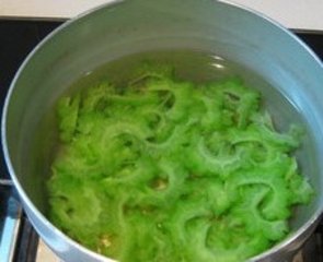 2、将苦瓜去籽切薄片,锅中入水烧开,加适量盐,放入苦瓜片快速焯烫后,捞起再放入凉水中浸泡。