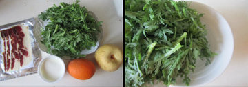 春天不减肥,夏季徒伤悲,我的春季减肥计划也提上了日程(没想到天变得这么快,这个日程好像晚了点),为了尽快瘦下来,平时在家运动也准备改去健身房了(花了钱是不是跳操更卖力呢?玩笑,不过好像集体锻炼效果确实好些, 大家都有相互监督的作用); 同时饮食上也不能忽略,会做美食就有这好处,对于食物热量、作用、烹饪等都很熟悉, 私人定制出自己特有的瘦身餐---火腿茼蒿水果酸奶沙拉,新鲜嫩绿的茼蒿, 配上些低脂的水果,再加上三片火腿,调味料汁放弃了高热量的沙拉酱, 而选用了低脂的酸奶,不仅味道不打折,而且能在享受美食的同时又能减肥瘦身。