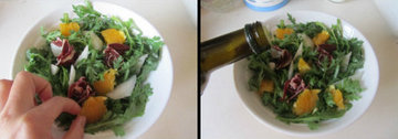5、将甜橙去皮、去膜后再切成小块放入,将表面浇淋一点橄榄油。