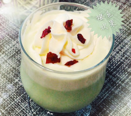2、将抹茶牛奶倒入杯中,挤上打发的淡奶油,撒上果干碎。