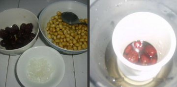1、黄豆加水泡至发胀发软,红枣洗净去核泡开。