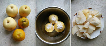 1、备好所用材料,梨子用细盐搓洗,再改刀备用。