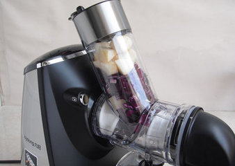 4、把紫甘蓝和雪梨间隔着放入九阳JYZ-E19倍多汁原汁。