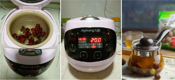 2、将红枣撕开,与其它食材下炖煲并加入多一点的清水,炖制1个半小时左右,就可以了。喜糖的朋友们还可以加点红糖或是黑糖。