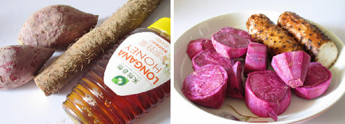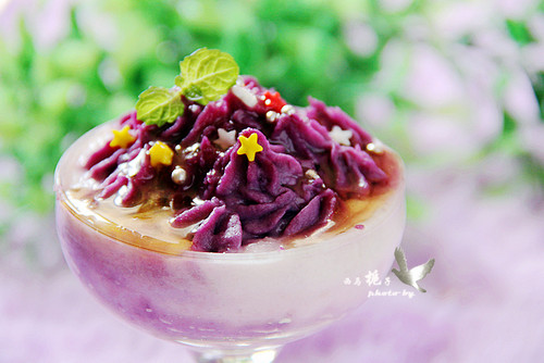 10、将山药泥和紫薯泥挤入容器中,上面浇上蜂蜜即可。