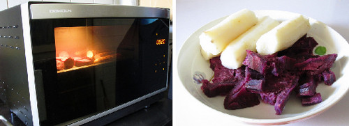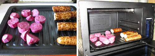 3、把山药和紫薯码放在蒸烤箱的烤盘上。