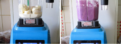 8、蒸熟的紫薯,也放入破壁机中你加入10克的糖 30克牛奶 30克淡奶油,启动浓汤程序,将紫薯搅打成泥。