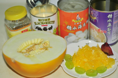 主料:亚答子1/2罐,海底椰适量,黑白淡奶30克,黄河蜜1/2个