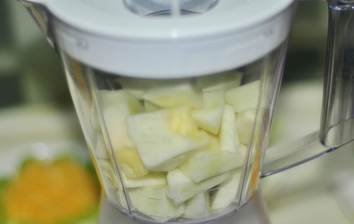 2、橙子去皮撕去白膜,果肉撕小块。青葡萄对半切开去籽。黄河蜜去皮去瓤,切小块。海底椰切小丁。