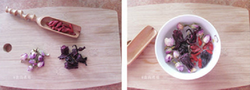 主料:玫瑰花10克,洛神花10克,枸杞子5克