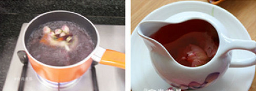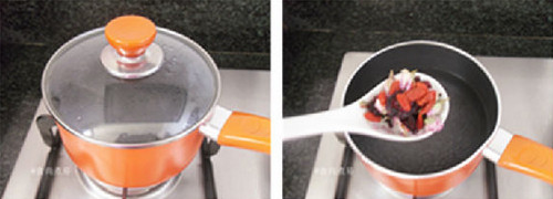 3、烧开适量清水,倒入玫瑰花、洛神花、枸杞子煮开,倒入茶壶中浸泡片刻即可。