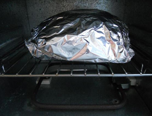3、把烤箱温度调到250°预热3分钟后,把包裹好的白菜放入烤箱,烤20分钟。