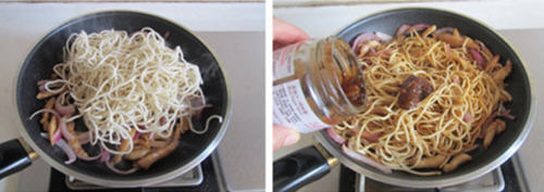 3、先煸炒洋葱,煸出香味后加入鸡丝煸炒直至变色;再加入面条翻炒;