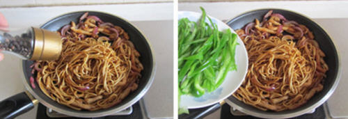 7、让黑椒汁均匀的裹在面条上, 再加入盐和黑胡椒碎继续翻炒;