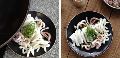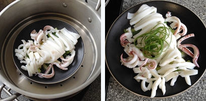 清蒸鱿鱼的做法跟清蒸鱼类似,但是做这道菜一定要用新鲜的鱿鱼,自己处理好后切成鱿鱼圈就开始上锅蒸。还多了一个焯水的步骤,整只入锅焯,时间不能长,大约1分钟,捞出来沥干水,切成圈再蒸。蒸的时候开水入锅,3分钟就关火,关火后不开盖虚蒸1分钟就好了,无需过多调料,一点点热油和蒸鱼豉油足已。