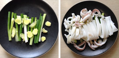 3、鱿鱼切成条(整只切圈),盘底摆上小葱段和姜片。