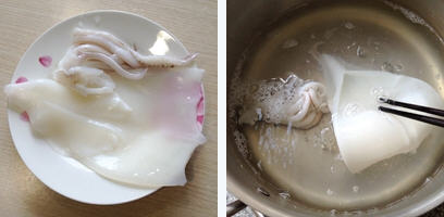 2、煮锅水开后将鱿鱼整只放入焯约1分钟,鱿鱼刚变白即可捞出控水。