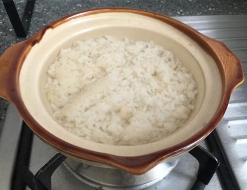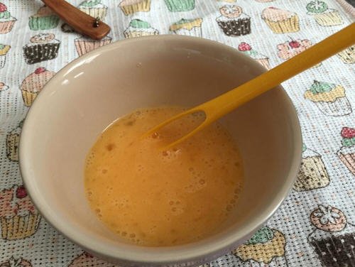 5、稀饭煮滚后,转小火,将蛋液倒入搅。