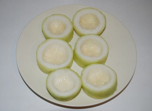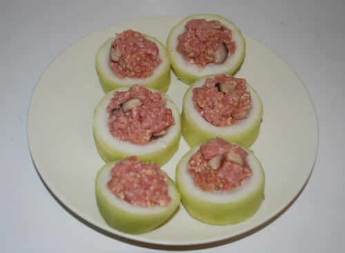3、节瓜内擦上少许太白粉,酿入肉馅。